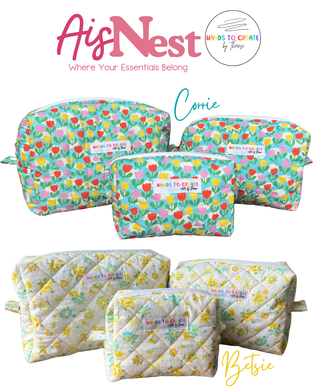 Each AisNest is handmade with love and joy, quilted and crafted from cotton with/or polyester fabric with inner pockets to keep your things tidy.