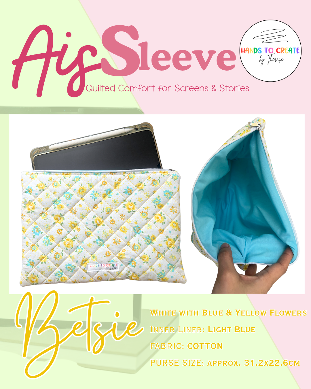 Handmade with love & joy using cotton fabric, AisSleeve is designed to hold your iPad, tablet, or favorite book with ease. Light padding offers gentle protection, while the fabric print adds a subtle touch of charm.